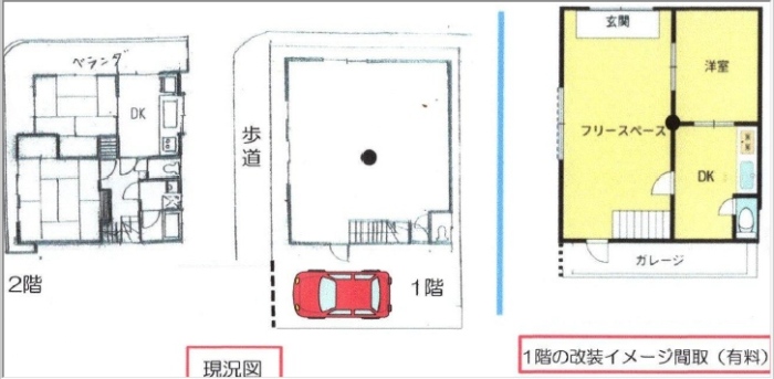 | 設備・条件 | 都市ガス公営水道排水下水北西角地 1階店舗約33.3帖あり 1階改装イメージ間取りあり(有料) 駐車1台可 ●住宅ローンお任せ下さい。(自営業・派遣社員・過去に住宅ローンが組めなかった方など) ●下記キャンペーン実施中 ①当社、《手数料》 キャンペーン実施中(弊社ホームページに多数あります。) ②《買い取り》 キャンペーン実施中 詳しくはお問い合わせください。 | ||